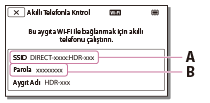 - PlayMemories Mobile uygulamasını çalıştırın, daha sonra akıllı telefon ekranında bu ürünün LCD ekranında görüntülenen SSID seçimini yapın ve bu ürünün LCD ekranında görüntülenen parolayı girin.