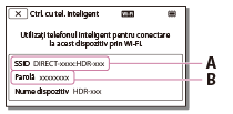 - Porniţi aplicaţia PlayMemories Mobile şi apoi, pe ecranul telefonului inteligent, selectaţi numele SSID afişat pe monitorul LCD al acestui produs şi introduceţi parola afişată pe monitorul LCD al acestui produs.