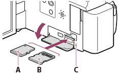 microSDメモリーカード:イラストAの向きにして、「カチッ」というまで押し込む。