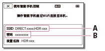 - 启动PlayMemories Mobile,然后在智能手机屏幕上选择本机液晶显示屏上显示的SSID,再输入本机液晶显示屏上显示的密码。