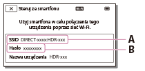 - Uruchom program PlayMemories Mobile, na ekranie smartfonu wybierz nazwę SSID wyświetloną na monitorze LCD tego urządzenia, a następnie wprowadź hasło wyświetlone na monitorze LCD tego urządzenia.