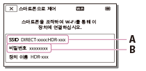 - PlayMemories Mobile을 시작한 다음, 스마트폰 화면에서 제품의 LCD 모니터에 표시된 SSID를 선택하고 제품의 LCD 모니터에 표시된 패스워드를 입력하십시오.