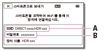 - PlayMemories Mobile 을 시작한 다음, 스마트폰 화면에서 제품의 LCD 모니터에 표시된 SSID를 선택하고 제품의 LCD 모니터에 표시된 패스워드를 입력하십시오.
