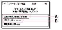 - PlayMemories Mobileを起動して、スマートフォンの画面で本機に表示されているSSIDを選択して、本機に表示されているパスワードを入力する。