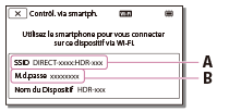 - Ouvrez PlayMemories Mobile, puis sélectionnez sur l'écran de votre smartphone le SSID affiché sur l'écran LCD de votre appareil et entrez le mot de passe qui apparait sur l'écran LCD de votre appareil.