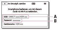 - Starten Sie PlayMemories Mobile, und wählen Sie dann auf dem Smartphone-Bildschirm die auf dem LCD-Monitor dieses Produkts angezeigte SSID aus, und geben Sie dann das auf dem LCD-Monitor dieses Produkts angezeigte Passwort ein.