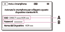 - Avviare PlayMemories Mobile, quindi sullo schermo dello smartphone, inserire selezionare l’SSID visualizzato sul monitor LCD del prodotto, quindi inserire la password visualizzata sul monitor LCD del prodotto.