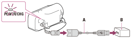 - Jakmile je modul akumulátoru plně nabitý, indikátor POWER/CHG (nabíjení) zhasne. Odpojte pomocný spojovací kabel USB od videokamery.