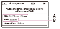 - Na monitoru LCD videokamery se zobrazí identifikátor SSID a heslo. Videokameru lze nyní ovládat pomocí smartphonu.