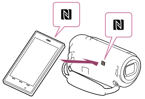 (značka N) zobrazí na monitoru LCD videokamery. - Podržte videokameru a smartphone u sebe přibližně na 1–2 sekundy, dokud se ve smartphonu nespustí aplikace PlayMemories Mobile.