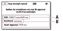 - Start PlayMemories Mobile en selecteer op het smartphonescherm de SSID die wordt weergegeven op het LCD-scherm van dit product. Voer vervolgens het wachtwoord in dat wordt weergegeven op het LCD-scherm van dit product.