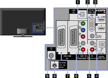 - Pokud je zařízení vybaveno konektorem DVI, zapojte jej k HDMI IN 4 přes rozhraní DVI - HDMI adaptéru (není součástí dodávky) a připojte výstupní audio konektory zařízení k PC/HDMI 4 AUDIO IN které se nachází v PC IN.