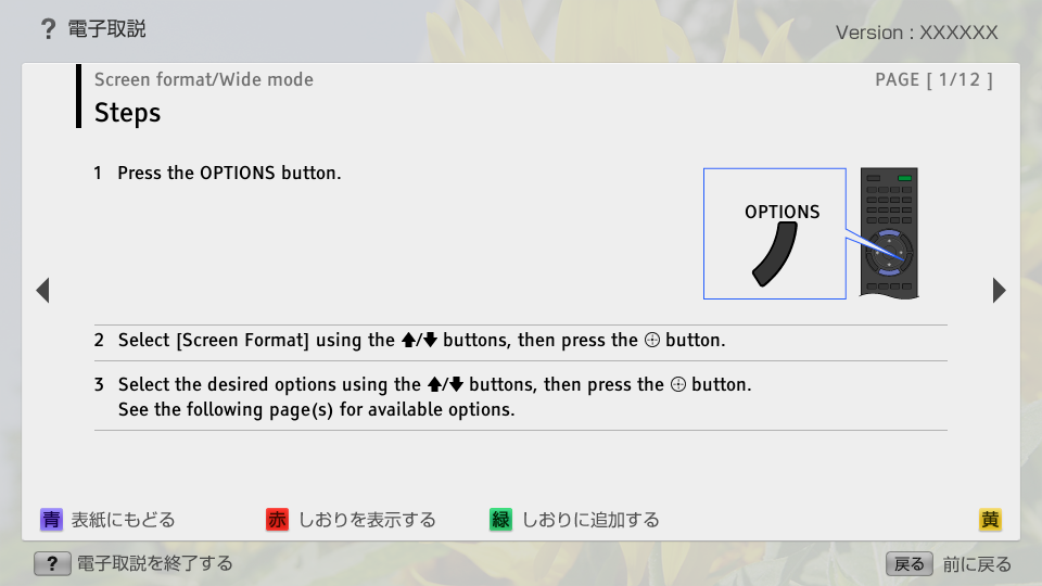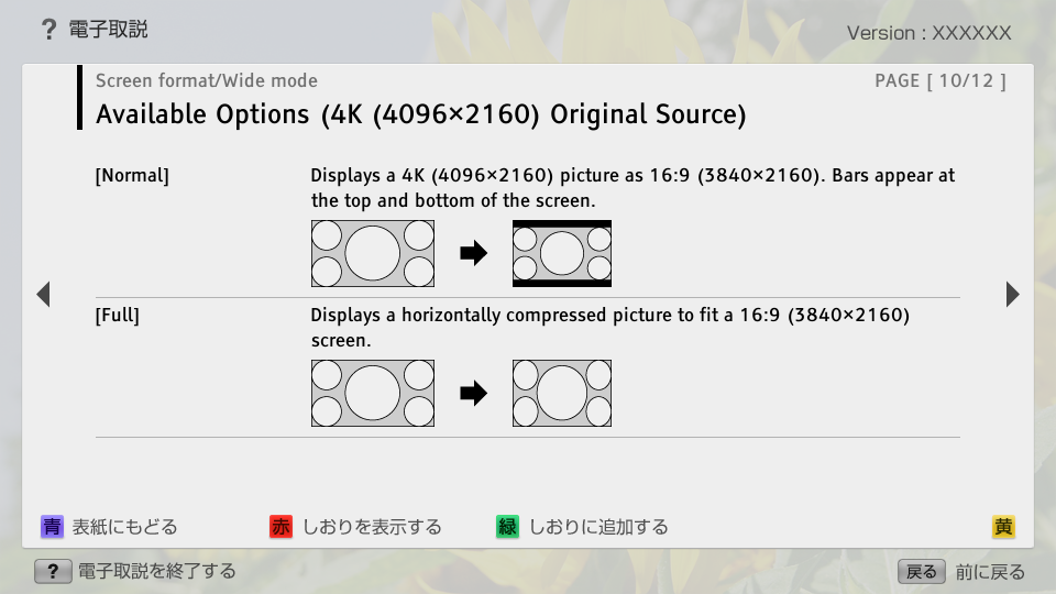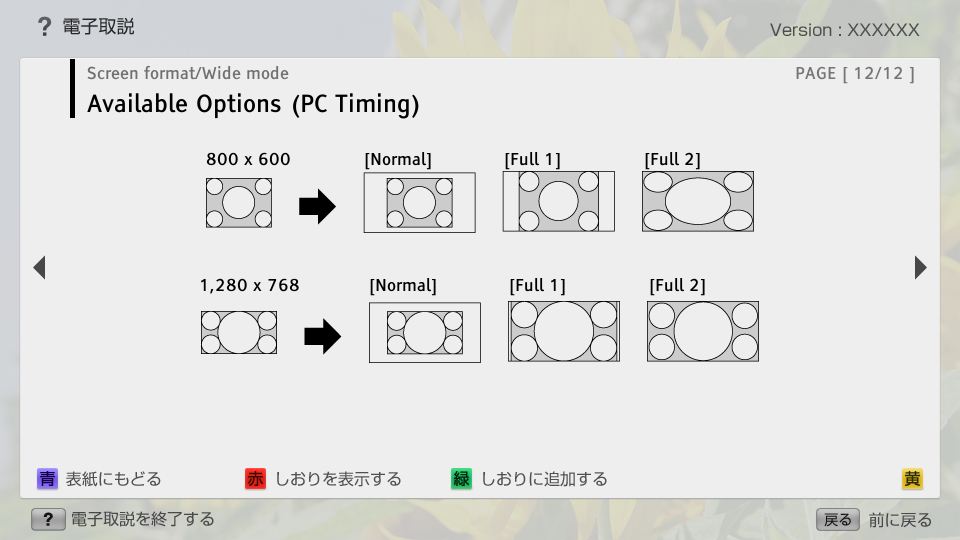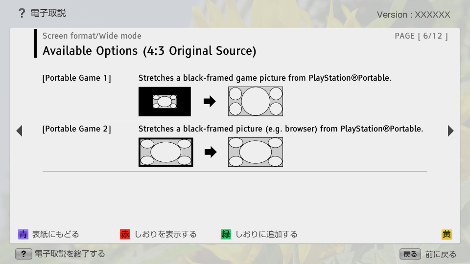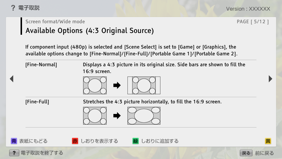 - If component input (480p) is selected and [Scene Select] is set to [Game] or [Graphics], the available options change to [Fine-Normal]/[Fine-Full]/[Portable Game 1]/[Portable Game 2].