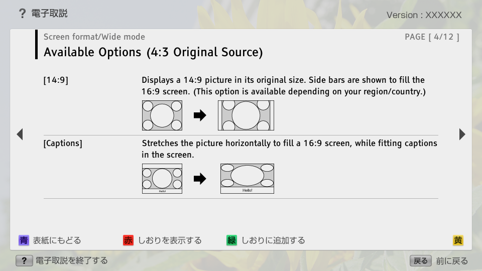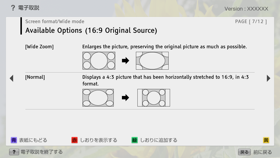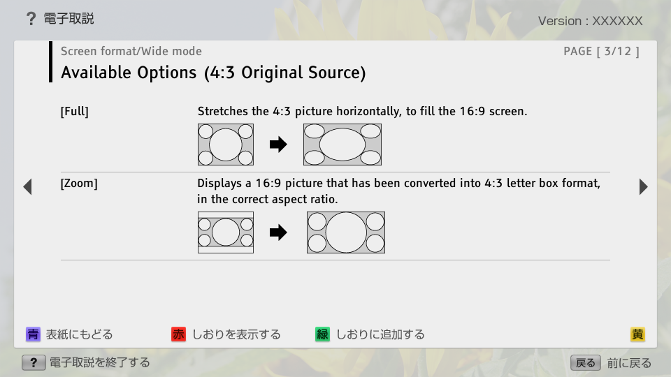 - Displays a 4:3 picture that has been horizontally stretched to 16:9, in 4:3 format.