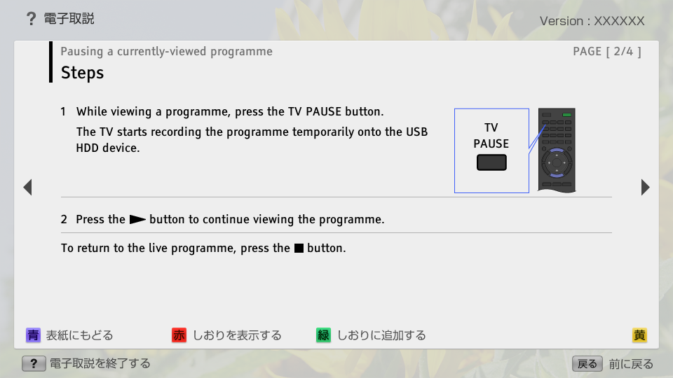 You can pause the currently-viewed programme. This function is convenient if you need to take a break from viewing.