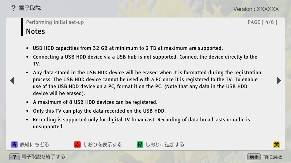 - ・ Any data stored in the USB HDD device will be erased when it is formatted during the registration process. The USB HDD device cannot be used with a PC once it is registered to the TV. To enable use of the USB HDD device on a PC, format it on the PC. (Note that any data in the USB HDD device will be erased).