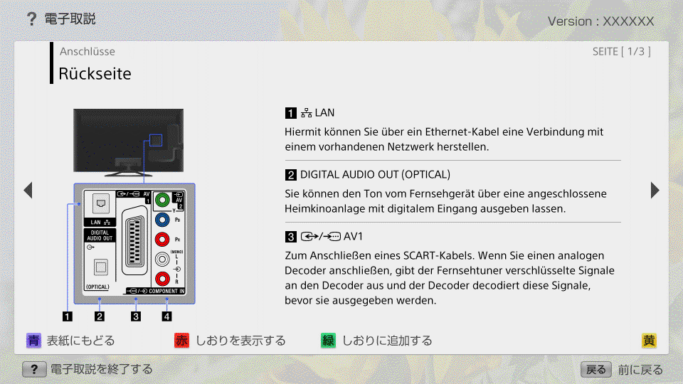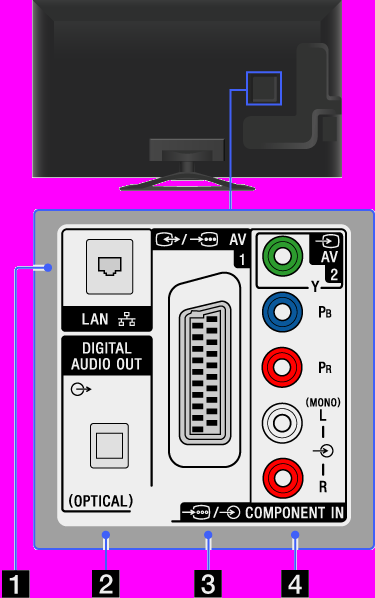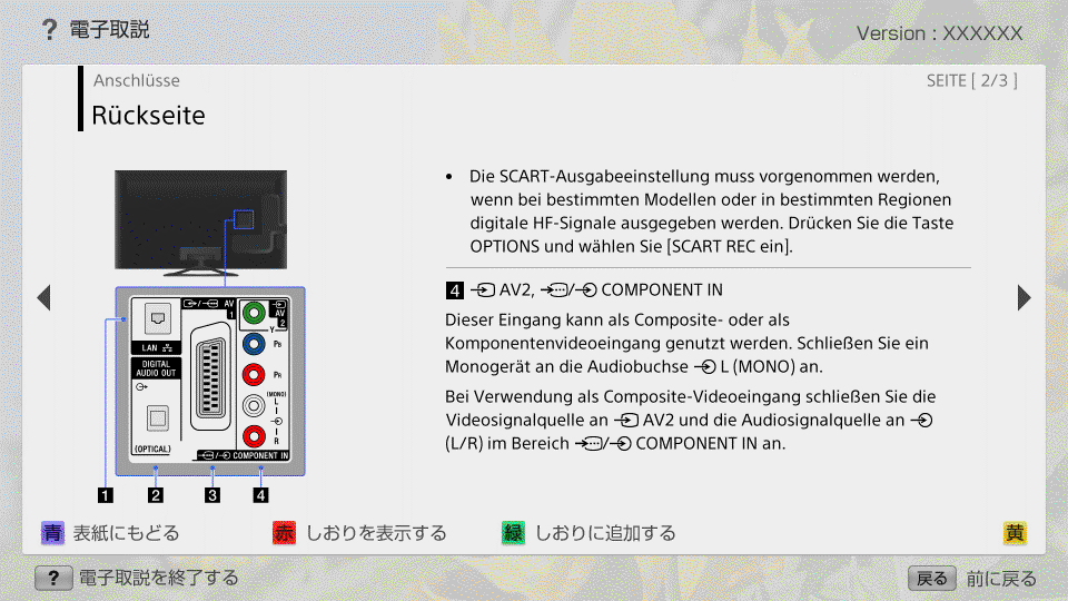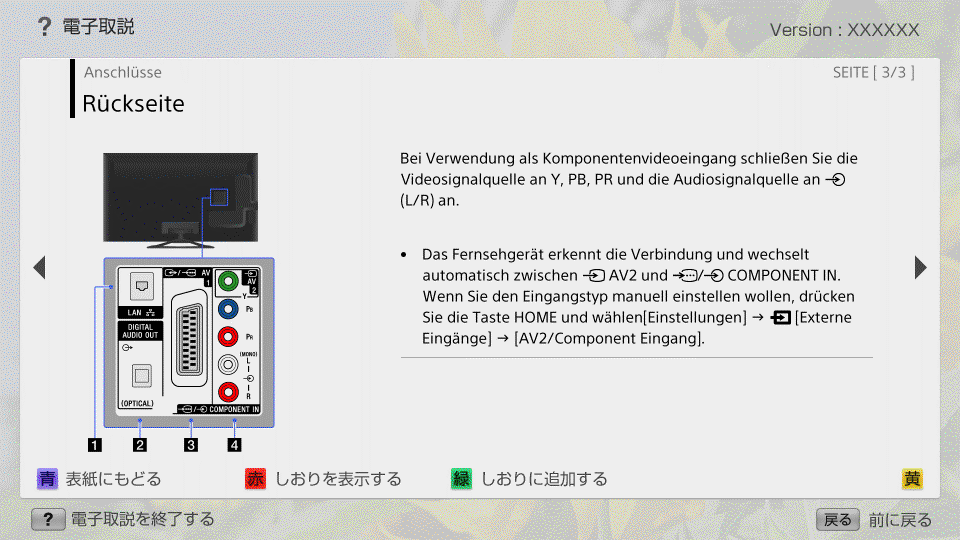 ・ Das Fernsehgerät erkennt die Verbindung und wechselt automatisch zwischen AV2 und / COMPONENT IN. Wenn Sie den Eingangstyp manuell einstellen wollen, drücken Sie die Taste HOME und wählen [Einstellungen] → [Externe Eingänge] → [AV2/Component Eingang].