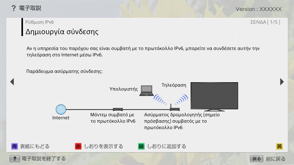 - Αν η υπηρεσία του παρόχου σας είναι συμβατή με το πρωτόκολλο IPv6, μπορείτε να συνδέσετε αυτήν την τηλεόραση στο Internet μέσω IPv6.