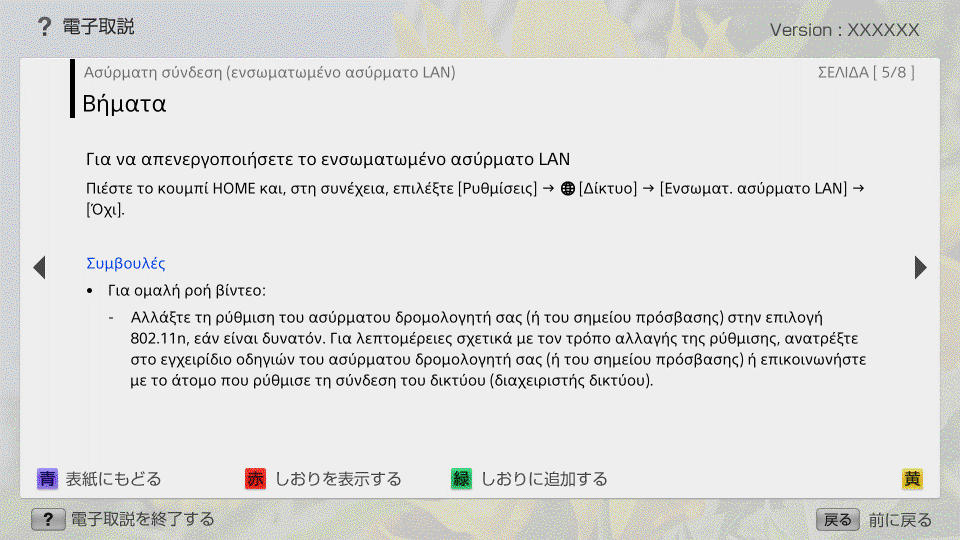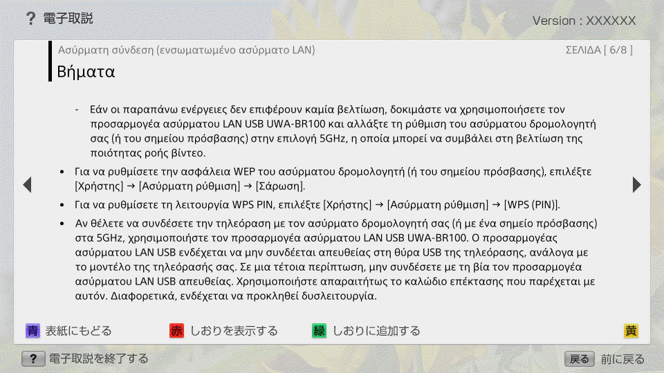 - - Εάν οι παραπάνω ενέργειες δεν επιφέρουν καμία βελτίωση, δοκιμάστε να χρησιμοποιήσετε τον προσαρμογέα ασύρματου LAN USB UWA-BR100 και αλλάξτε τη ρύθμιση του ασύρματου δρομολογητή σας (ή του σημείου πρόσβασης) στην επιλογή 5GHz, η οποία μπορεί να συμβάλει στη βελτίωση της ποιότητας ροής βίντεο.