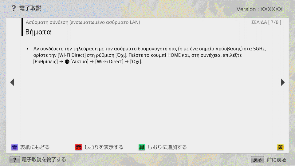 - ・ Αν συνδέσετε την τηλεόραση με τον ασύρματο δρομολογητή σας (ή με ένα σημείο πρόσβασης) στα 5GHz, ορίστε την [Wi-Fi Direct] στη ρύθμιση [Όχι]. Πιέστε το κουμπί HOME και, στη συνέχεια, επιλέξτε [Ρυθμίσεις] →