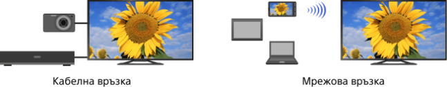 Свързвайте различни устройства (като например BD записващо устройство, цифров фотоапарат, персонален компютър, смартфон, таблет) към телевизора. Можете да възпроизвеждате съдържание, като например картини и музика, на свързаното устройство.