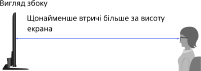 - Рекомендований кут і відстань перегляду можуть відрізнятися залежно від розташування телевізора й умов усередині приміщення.