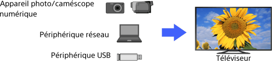 Une photo d’une résolution égale ou supérieure à 4K peut être affichée en résolution 4K (3 840 × 2 160). Un appareil photo/caméscope numérique qui correspond à la sortie 4K HDMI connectée à HDMI IN ou une photo haute résolution stockée sur un périphérique USB ou un périphérique réseau apparaît sur le téléviseur en résolution 4K.