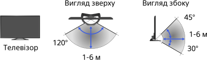- Рекомендований кут і відстань перегляду можуть відрізнятися залежно від розташування телевізора й умов усередині приміщення.
