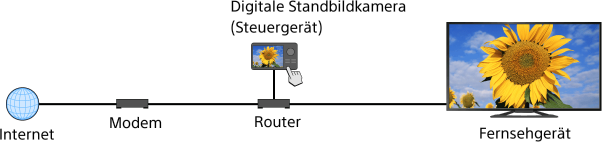 Sie können Foto-/Musik-/Videodateien, die auf einem Steuergerät (z. B. einer digitalen Standbildkamera) gespeichert sind, auf dem Fernsehschirm anzeigen bzw. wiedergeben lassen und dabei das Steuergerät direkt bedienen. Dazu muss auch das Steuergerät Renderer-kompatibel sein.