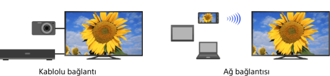Çeşitli cihazları (örn. BD kaydedici, dijital fotoğraf makinesi, PC, akıllı telefon, tablet) TV’ye bağlayın. Resimler ve müzik gibi içeriği bağlı cihazlarda oynatmanın keyfini çıkarabilirsiniz.