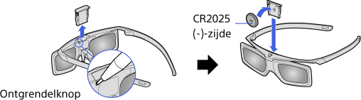 Als de led-aanduiding op een lage batterijlading wijst (aanduiding knippert elke 2 seconden 3 keer groen (geel tijdens SimulView™-modus)), dient u de batterij te vervangen. Gebruik hiervoor alleen een CR2025-batterij. Druk op de ontgrendelknop met de punt van een pen enz., verwijder het batterijvak en vervang vervolgens de batterij door een nieuwe. Zorg er daarna voor dat de batterij degelijk is vergrendeld.