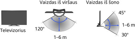 - Rekomenduojamas žiūrėjimo kampas ir atstumas priklauso nuo televizoriaus vietos ir patalpos sąlygų.