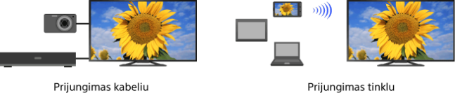 Prijunkite prie savo televizoriaus įvairius prietaisus (pvz., BD rašytuvą, skaitmeninį fotoaparatą, kompiuterį, išmanųjį telefoną ar planšetinį kompiuterį). Galėsite mėgautis prijungto prietaiso atkuriamu turiniu, pvz., nuotraukomis ir muzika.