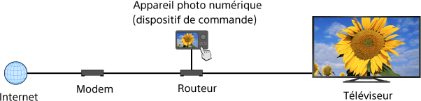 Vous pouvez lire les fichiers photo/audio/vidéo stockés dans un dispositif de commande (par exemple, dans un appareil photo numérique) sur l’écran du téléviseur en commandant directement ce dispositif. Le dispositif de commande doit également être compatible avec la fonction Renderer.