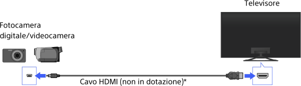 Collegare la fotocamera digitale Sony o la videocamera usando un cavo HDMI. Utilizzare un cavo dotato di una presa mini HDMI per fotocamera digitale/videocamera a un’estremità, e una presa standard HDMI per l’estremità del televisore.