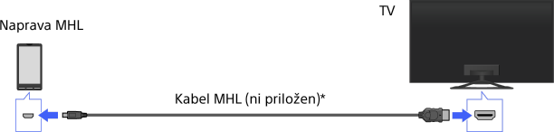 - Ko je TV v stanju pripravljenosti, lahko napravo MHL polnite prek televizorja s kablom MHL, če je za [Polnjenje MHL v izključenem stanju] izbrano [Vključeno].