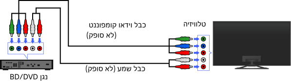 אם נגן ה-BD/DVD שלך מצויד בשקעי וידאו קומפוננט, חבר אותו אל הטלוויזיה בעזרת כבל וידאו וכבל שמע קומפוננט.