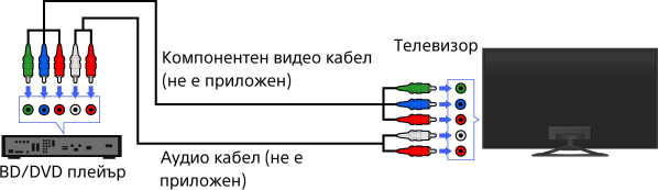 Ако вашият BD/DVD плейър има гнездо за компонентно видео, свържете го към телевизора, като използвате компонентен видео кабел и аудио кабел.