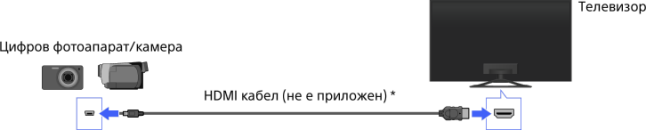 Свържете вашия цифров фотоапарат Sony или камера с HDMI кабел. Използвайте кабел, който има мини HDMI жак от страната на цифровия фотоапарат/камерата и стандартен HDMI жак от страната на телевизора.