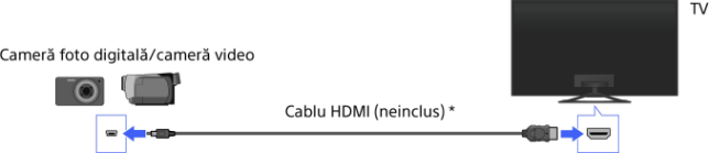Conectaţi camera foto digitală Sony sau camera video utilizând un cablu HDMI. Utilizaţi un cablu cu mini jack HDMI pentru capătul de la camera foto digitală/camera video, respectiv un jack HDMI standard pentru capătul de la TV.