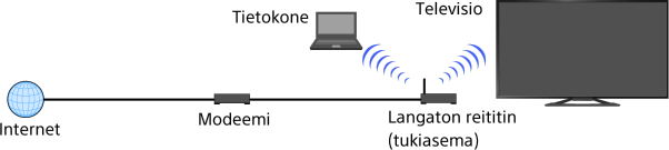 - Jos haluat kytkeä television 5 GHz:n langattomaan reitittimeen (tai tukiasemaan), käytä USB-WLAN-sovitinta UWA-BR100. Televisiomallista riippuen USB-WLAN-sovitinta ei ehkä voida kytkeä suoraan television USB-liitäntään. Älä yritä tällöin kytkeä USB-WLAN-sovitinta suoraan väkisin. Muista käyttää sen mukana toimitettua jatkokaapelia. Muussa tapauksessa seurauksena voi olla toimintahäiriö.