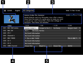 Voit etsiä nopeasti haluamasi ohjelmat ja tarkat ohjelmatiedot. Lisäksi voit etsiä ohjelmia tyylilajin perusteella, rekisteröidä suosikkiohjelmasi jne. (Tämä toiminto on käytettävissä vain digitaalilähetyksille ja mallista/alueesta/maasta riippuen.)