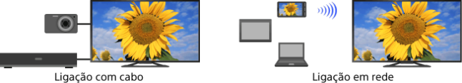 Ligue vários dispositivos (por exemplo, gravador de BD, câmara fotográfica digital, PC, smartphone, tablet) ao televisor. Pode desfrutar da reprodução de conteúdos, tais como imagens e música no dispositivo ligado.