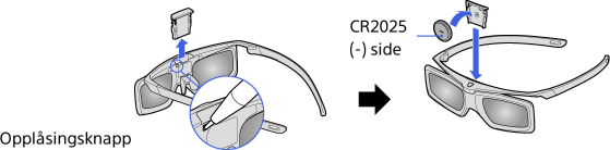 Hvis LED-en indikerer lav batteristrøm (indikator blinker grønt (gult ved SimulView™-modus) 3 ganger hvert 2. sekund), skifter du ut batteriet. Bruk bare et CR2025-batteri. Trykk på opplåsingsknappen med tuppen på en penn, e.l. og ta ut batterietuiet, skift deretter ut batteriet med et nytt. Etterpå må du sørge for at batterietuiet låses igjen.