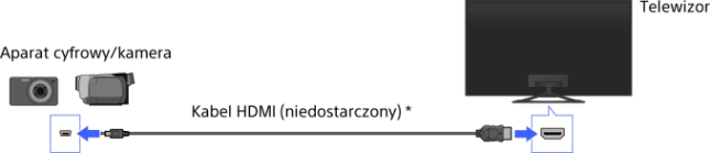 Podłącz swój aparat cyfrowy lub kamerę Sony za pomocą kabla HDMI. Użyj kabla wyposażonego w złącze mini jack HDMI po stronie aparatu/kamery i standardowe złącze jack HDMI po stronie telewizora.