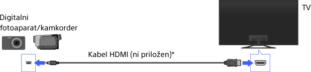 Digitalni fotoaparat Sony ali kamkorder priključite s kablom HDMI. Uporabite kabel, ki ima mini vtič HDMI za digitalni fotoaparat/kamkorder in običajni vtič HDMI za televizor.