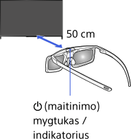 Naudodami aktyviuosius 3D akinius pirmą kartą, laikykite juos 50 cm atstumu nuo televizoriaus, įjunkite televizorių, paskui 2 sekundes palaikykite nuspaudę ant akinių esantį