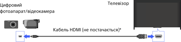 Підключайте цифровий фотоапарат або відеокамеру Sony за допомогою кабелю HDMI. Використовуйте кабель із міні-штекером HDMI для підключення до цифрової фото-/відеокамери та стандартним штекером HDMI для підключення до телевізора.