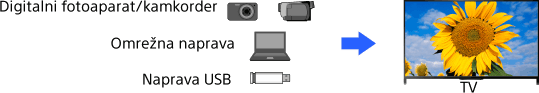 Fotografijo ločljivosti 4K ali višje je mogoče prikazati z ločljivostjo 4K (3840 × 2160). Digitalni fotoaparat/kamkorder s podporo izhoda HDMI 4K povežite z izhodom HDMI IN na TV-ju za prikaz fotografij visoke ločljivosti iz fotoaparata. Fotografije v visoki ločljivosti lahko prikažete tudi iz priključenih naprav USB ali domačega omrežja.