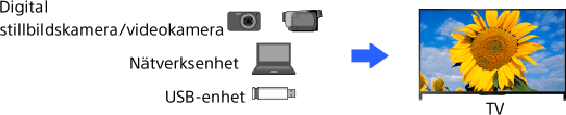 En bild med en 4K-upplösning eller högre kan visas med 4K-upplösning (3840×2160). Du kan ansluta en digital stillbildskamera/videokamera som har stöd för HDMI 4K-utmatning till HDMI IN på TV:n för att visa de bilder med hög upplösning som lagrats på kameran. Det går även att visa bilder med hög upplösning som lagrats på anslutna USB-enheter eller ditt hemmanätverk.